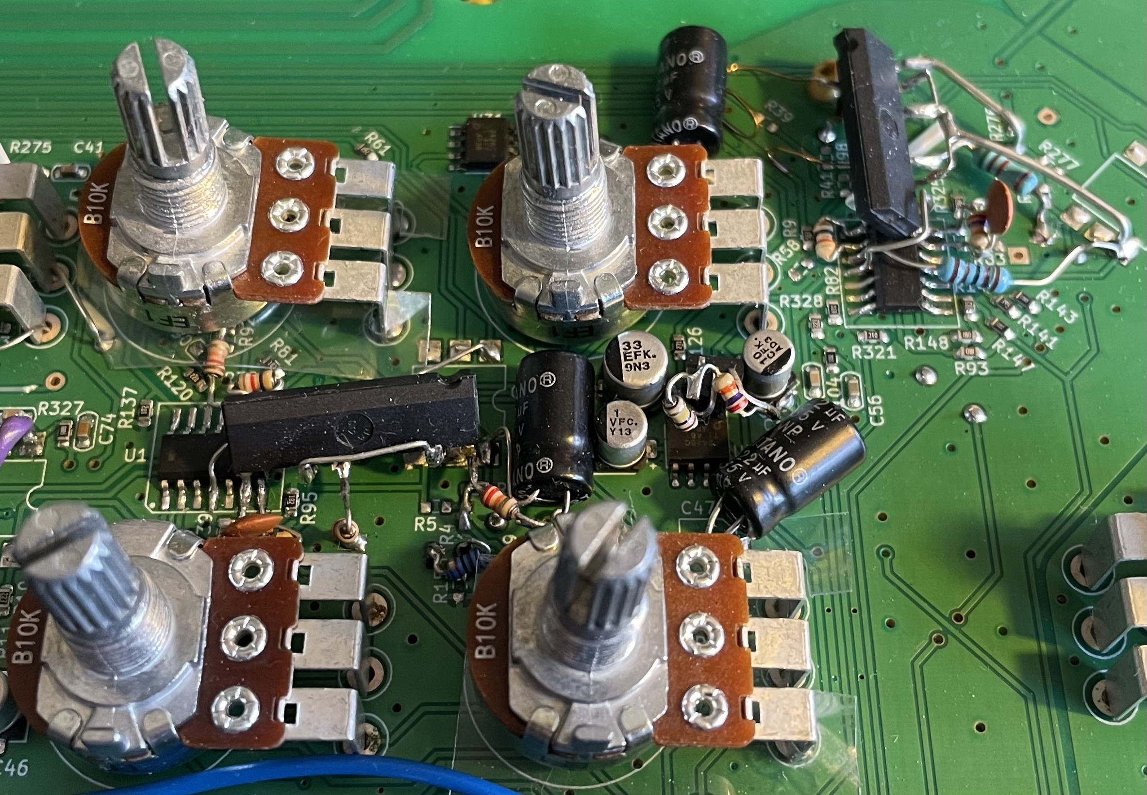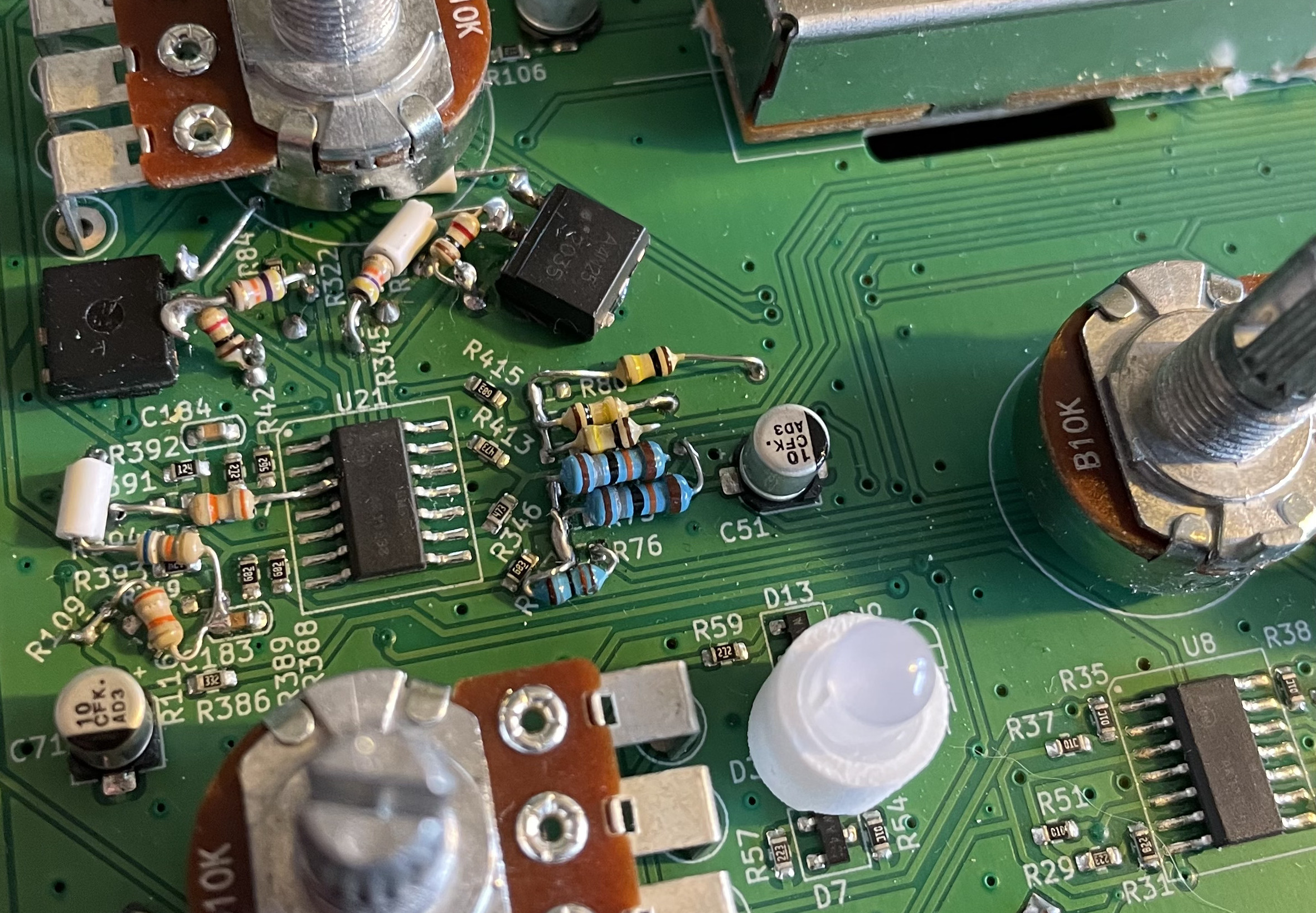 Low prototyping funds meant we had to go with a second version, and this one still required a fair bit of rework - a few op-amps had to be reconfigured, like this: